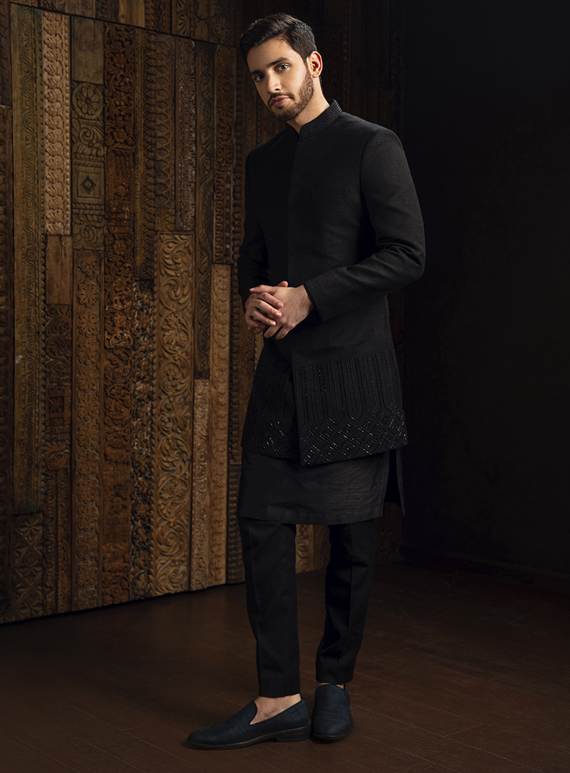 A black matka silk jacket with tonal glass pipe and bead embroidery. It is worn over a raw silk kurta and paired with matching trousers.