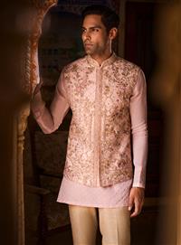 A pastel pink raw silk jacket with fine resham and peeta. This is teamed with a satin organza kurta and matka silk trousers.
