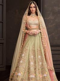 An olive green panelled lehenga in raw silk with floral and baroque motifs artistically placed on the panels. This is teamed with an intense pink cut work organza dupatta and a tulle head veil.