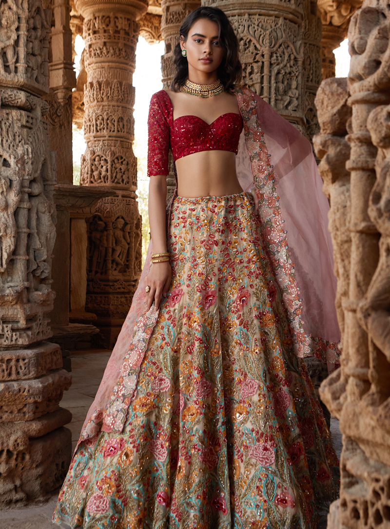 A beautiful spring-bloom lehenga in ivory tulle. Multiple colours of resham have been used to create this background. This is worn with a contrast blouse and an organza dupatta.