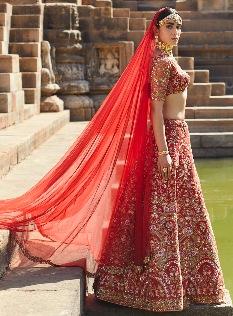 A classic ruby red lehenga in raw silk, heavily embellished with subtle gold zardozi and peeta embroidery. This is teamed with a classic bridal blouse and tulle head veil.