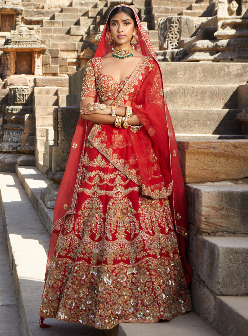 A classic kalidaar lehenga in scarlet red with elaborate zardozi and ari embroidery. This is worn with a floral jaal blouse, tulle dupatta and head veil.