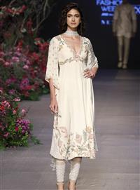 Ivory crepe kalidar dress with bell sleeves with dainty floral work done in sequins, resham, glasspipes and peeta work paired with matching churidar and dupatta.