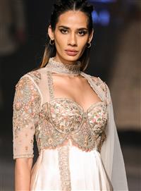 An Ivory corset cowl dress with dense floral work done in multiple hues of resham highlighted with glasspipes and sequins. It is teamed up with a matching dupatta and churidar.