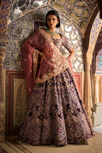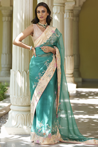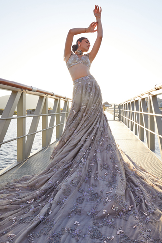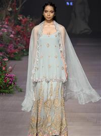 A powder blue sharara set with embroidery on the sharara. Paired with a top and an organza ruffle dupatta which completes the look.