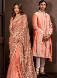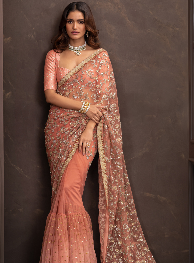 An intense pink tulle saree with intricate antique gold peeta and aari embroidery all over.